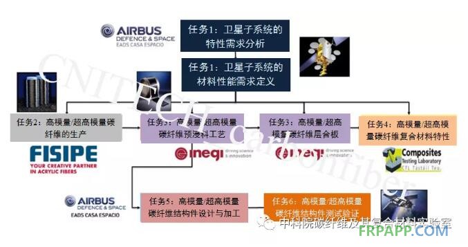 為了實(shí)現(xiàn)EUCARBON項(xiàng)目的目標(biāo),結(jié)合不同參與單位的優(yōu)勢(shì),因此將項(xiàng)目分為四個(gè)子項(xiàng)目進(jìn)行實(shí)施,分別為:空間應(yīng)用設(shè)計(jì)、制造和測(cè)試(由EADS CASA Espacio牽頭)、高模量/超高模量碳纖維生產(chǎn)(由Fisipe牽頭)、預(yù)浸料和CFRP層壓板的制造(由INEGI牽頭)、復(fù)合材料特性研究(由CTL牽頭)。