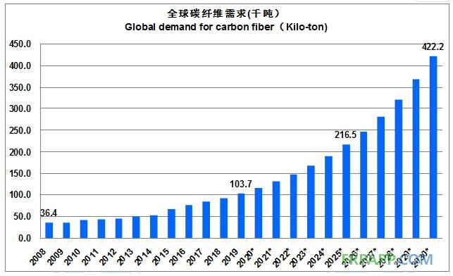 2019年,全球碳纖維經歷了60年的努力,把碳纖維的需求第一次做到10萬噸以上。這是碳纖維復合材料產業鏈的復雜性決定的。當絕大部分核心技術被人類掌握之后,下一個10萬噸的增長,時間會急劇縮短,我們預測2025年就會進入20萬噸,2030年會進入40-50萬噸。