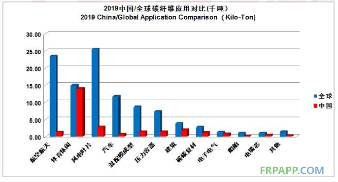 與2018年的特點類似,中國需求的超高增長的主要驅動者是風電葉片市場:2019年風電消耗13,800噸碳纖維,對比2108年的8,000噸,增長率72.5%。2019年用于風電的國產碳纖維大約有1,000噸,而2018年是全部進口。顯然,這幾年跳躍式增長的風電葉片用量(2017:3,060噸,2018:8,000噸,2019:13,800噸),給國內碳纖維企業帶來了難得的發展機遇。