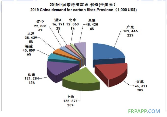 上千噸用量的省份有6家,江蘇由于風電碳纖維的消耗,把長期排名第一的廣東省推到第二名。江蘇省是中國歷史上首次突破萬噸規模的省份。