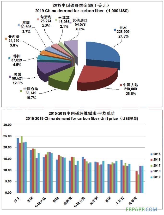 2019年中國碳纖維的總需求為:37,840噸,對比2018年的31,000噸,同比增長了22%,其中,進口量為25,840噸(占總需求的68%,比2018增長了17.5%),國產纖維供應量為12,000噸(占總需求的31.7%,比2018年增長了33%),2019年的中國市場的總體情況是:供不應求,無論是進口還是國產纖維。