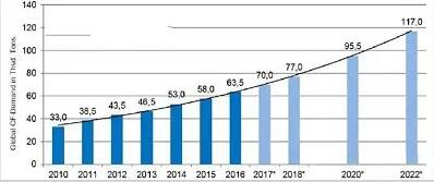 以中國高速動車3500組車的規模估算,碳纖維復合材料份額若占到30%,將產生50萬噸需求,若推廣至城軌車輛共約100萬噸,即使只有10% 的應用,也有約30萬噸。若能良性發展,預計共可形成每年3~5萬噸市場規模。因此,碳纖維在高鐵領域的應用一旦突破,每年就會產生對國產碳纖維萬噸以上的需求,中國高鐵領域的國產碳纖維每年潛在需求量超過目前國產碳纖維的全部產量。