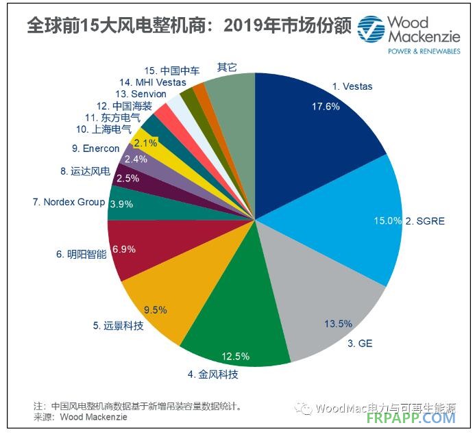 2019年,風電整機市場在加速整合中。排名前五名的整機商(維斯塔斯、西門子歌美颯、通用電氣、金風科技和遠景能源)的市場份額總和相比去年增加了10%,接近全球風電機組產能的7成。
