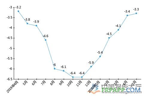 2020年1-5月玻璃纖維和玻璃纖維增強(qiáng)塑料制品制造工業(yè)生產(chǎn)者出廠(chǎng)價(jià)格指數(shù)同比漲跌圖(%)
