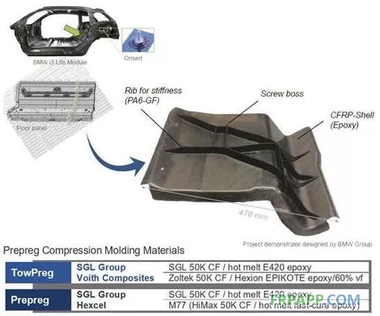 大批量生產的示范:寶馬i3生命模塊地板的一部分被選中用來演示這項工藝用于大批量生產的可擴展性。為模壓成型該部件的殼體,評估了4種不同的環氧預浸料(圖片來自亞琛工業大學AZL)