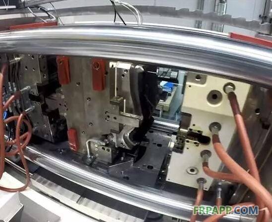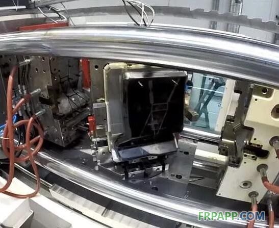 安裝在水平轉模板上的模具擁有兩個不同的成型型腔,用于兩種不同的成型工藝,即環氧預浸料的模壓成型和熱塑性塑料的二次注射成型。