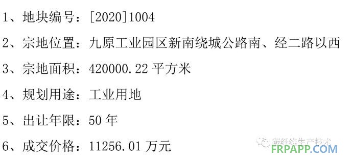 復材24日晚間公告稱,公司控股子公司內蒙古光威近日與包頭市公共資源交易中心簽署了《包頭市國有建設用地使用權掛牌出讓成交確認書》,該宗地位于九原工業(yè)園區(qū)新南繞城公路南、經二路以西,面積42萬平方米,規(guī)劃用途為工業(yè)用地,成交價格1.13億元。