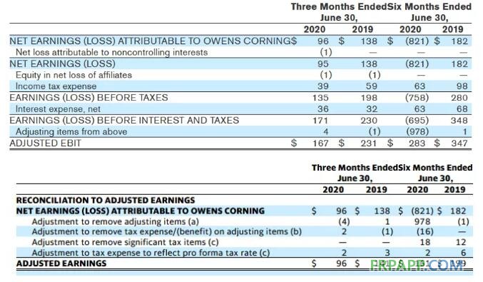 2020年第二季度歸屬歐文斯科寧凈利潤為9600萬美元,而2019年同期為1.38億美元。第二季度調整后的息稅前利潤為1.67億美元,而2019年同期為2.31億美元。