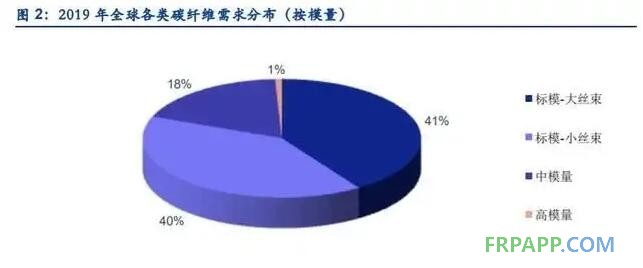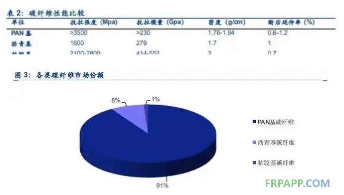 碳纖維按不同的原材料分類,可以分為 PAN 基碳纖維、瀝青基碳纖維或粘膠基碳纖維。PAN 基碳纖維的原料來源豐富,且其抗拉強度其他二者優越,因此 PAN 基碳纖維應用領域最廣, 比如航空航天、體育休閑、風電葉片、汽車工業、建筑補強等領域,市場份額占 90%以上。瀝青基碳纖維和粘膠基碳纖維的用途較為窄、產量小。通用級瀝青碳纖維強度和模量較低, 主要應用于保溫材料領域;高性能瀝青基碳纖維多用于航空航天的工程材料。粘膠基碳纖維 主要用于制作耐燒蝕和隔熱材料。