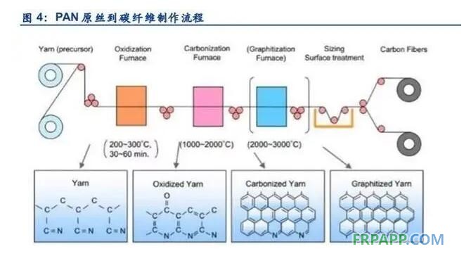 從 PAN 原絲到碳纖維,需要經過碳化、表面處理、上漿處理等過程。碳化指的是去除材料 中的非碳元素,使其碳含量超過 90%,由于 PAN 原絲的玻璃化溫度低于 100 攝氏度,因此 不能直接碳化,而需要先經過預氧化過程。碳化后,為了賦予纖維更好的粘合性能,需要對 它們進行表面處理,向纖維表面添加氧原子以提供更好的化學鍵合性,使它們的表面被輕微氧化,并且對表面進行蝕刻和粗糙化以獲得更好的機械粘合性能,可通過將纖維浸入各種氣 體如空氣、二氧化碳或臭氧中以及各種液體,如次氯酸鈉或硝酸中可以實現氧化。在表面處 理之后,需要涂覆纖維以保護它們在纏繞或編織期間免受損壞,此過程稱為上漿處理,涂層 材料包括環氧樹脂,聚酯,尼龍,聚氨酯等。