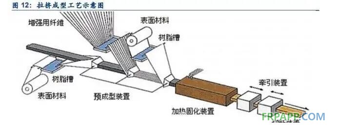 拉擠成型工藝適用于制造高纖維體積含量的低成本復合材料,如制造風電葉片的梁帽,其工 藝流程包括在牽引設備的作用下將連續纖維進行樹脂浸潤浸后通過成型模具加熱,擠出多余 樹脂,使其固化。該工藝可以連續成型,制品長度不受限制,縱向力學性能突出,生產過程 自動化程度高,生產效率高,制品性能穩定,成本低。缺點是只能生產線形產品,且橫向強度低。