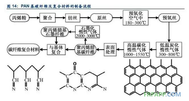 完整的碳纖維產業鏈包含從一次能源到終端應用的完整制造過程。從石油、煤炭或天然氣得 到丙烯,丙烯經氨氧化后得到丙烯腈,丙烯腈合和紡絲之后得到聚丙烯腈(PAN)原絲,再 經過預氧化、低溫和高溫碳化后得到碳纖維,并可制成碳纖維織物和碳纖維預浸料,作為生 產碳纖維復合材料的原材料;碳纖維經與樹脂、陶瓷等材料結合,形成碳纖維復合材料,最 后由各種成型工藝得到下游應用需要的最終產品。