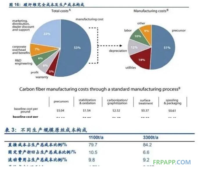 通常碳纖維生產成本構成中,原絲占 51%左右,大約 2.2 公斤原絲生產 1 公斤碳纖維。原絲 的生產過程中,折舊及能耗占比較大、約 40%,提高生產效率可以有效減少單噸折舊及能耗。