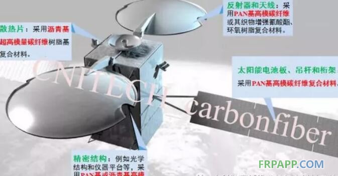 高模量碳纖維的高模特性可賦予其結構件高剛度,低膨脹特性可實現高低溫環境下零變形,因此是衛星結構件首選材料,目前國內外航天衛星系統廣泛采用高模量碳纖維材料。由于PAN基高模量碳纖維和瀝青基高模量碳纖維主要特點不同,前者強度高、后者模量更高,因此應用部位也有所不同。