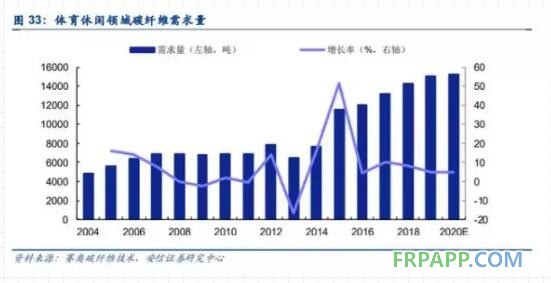 2019 年體育休閑領(lǐng)域碳纖維需求為 15000 噸,同比增長(zhǎng) 5%。體育休閑碳纖維市場(chǎng)產(chǎn)業(yè)規(guī)模穩(wěn)定,市場(chǎng)趨于飽和,短期內(nèi)不會(huì)出現(xiàn)快速增長(zhǎng)或明顯下滑。