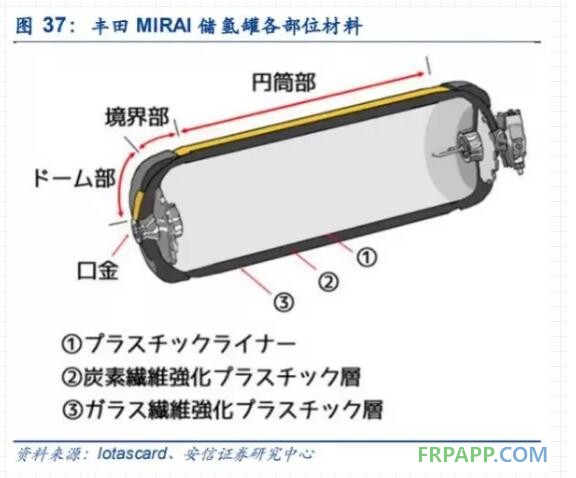 2014 年上市的豐田 MIRAI 是世界上第一款實(shí)現(xiàn)商業(yè)化的燃料電池汽車。MIRAI 共有一大(117L)一小(24L)兩個(gè) Ⅳ 型高壓氫氣罐,外殼中層采用碳纖維復(fù)合材料。