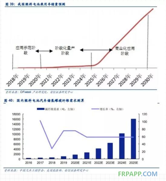 現(xiàn)階段我國(guó)氫燃料電池汽車還局限于客車和專用車。GGII 數(shù)據(jù)顯示,2019 年我國(guó)共生產(chǎn)氫燃料電池汽車 3018 輛,同比增長(zhǎng) 86.41%。其中客車共 1335 輛,占 44%;專用車共 1683 輛,占 56%。預(yù)計(jì)我國(guó)氫燃料電池客車和專用車 2020-2025 年將進(jìn)入?yún)^(qū)域成熟階段,2025-2030 年將進(jìn)入快速增長(zhǎng)階段;而燃料電池乘用車預(yù)計(jì) 2020-2025 年將會(huì)進(jìn)入階段量產(chǎn)階段,2025 年后將進(jìn)入商業(yè)化應(yīng)用階段。假設(shè)每輛氫燃料電池客車和專車消耗 320kg 碳纖維,2025 年氫燃料電池汽車產(chǎn)量達(dá)到 5 萬(wàn)輛,則碳纖維需求量將會(huì)達(dá)到 16000 噸,2020 年至 2025 年復(fù)合增長(zhǎng)率達(dá) 58%。