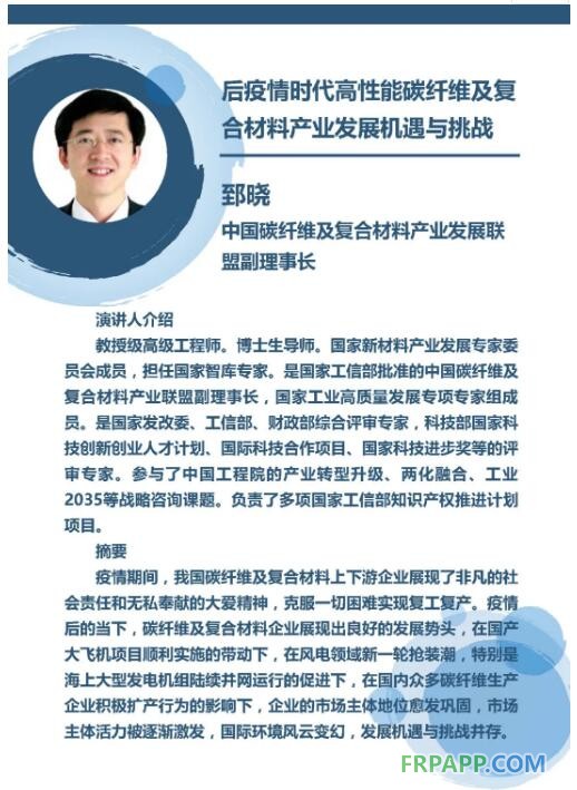 “中國碳纖維及復合材料產業發展聯盟”聯合“中國國際復材展”組委會,將于2020年9月2日-4日在上海舉辦的“第26屆中國國際復合材料工業技術展覽會”期間,舉辦“第六屆碳纖維及先進復合材料創新應用與發展”高層論壇。