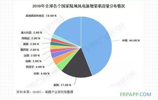 從新增裝機容量來看,2019年,全球陸地新增裝機容量排名前五的國家為中國、美國、印度、西班牙和瑞典。陸地新增裝機容量占2019年全球陸地風電新增裝機容量的比例分別為44%、17%、4%、4%和3%,合計占比為72%。