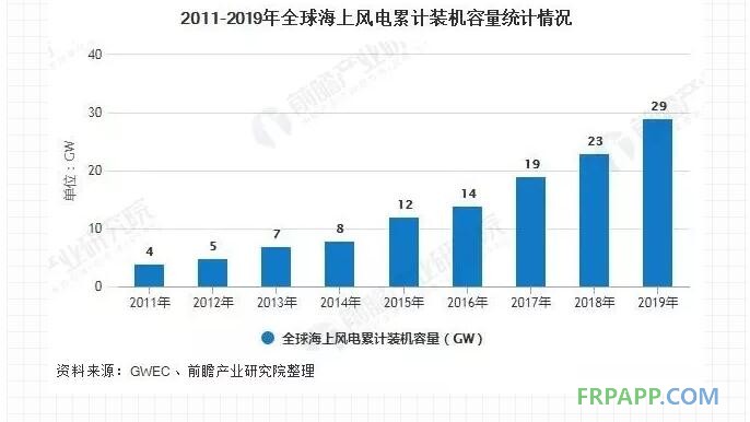 海上風電的優勢主要是風速較陸上更大,風垂直切變更小,湍流強度小,有穩定的信號主導方向,年利用小時長。此外,海上風電不占用土地資源,且接近沿海用電負荷中心,就地消納避免了遠距離輸電造成的資源浪費。根據GWEC的統計,2019年全球海上風電新增裝機創歷史新高,首次突破6GW,目前全球海上風電總裝機量超過29GW。