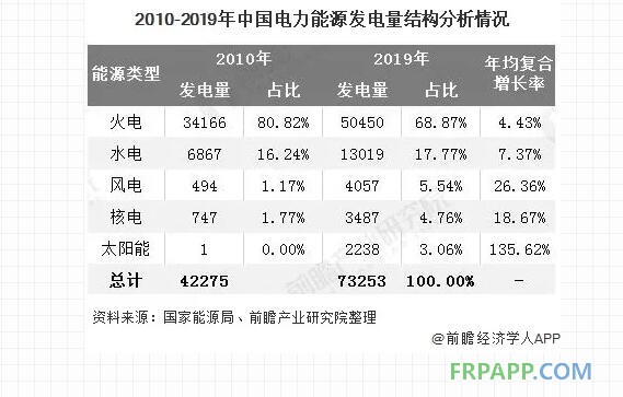 從中國近年來的電力能源看,風電已經成為僅次于火電和水電的第三大電力來源。2019年風電發電量為4057億千瓦時,占全國發電量的5.54%。2010年和2019年中國風電來源構成如下: