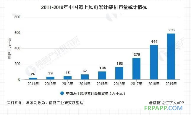 與全球風電行業發展趨勢保持一致,在中國風電行業整體快速發展的情況下,海上風電發展速度快于風電行業整體發展速度。截至2019年底,海上風電累計裝機容量593萬千瓦。