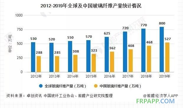 根據卓創資訊數據顯示,2009-2019年,全球玻璃纖維產量總體呈上升趨勢,2018年全球玻璃纖維產量為770萬噸,2019年達到800萬噸左右,較2018年同比增長3.90%。