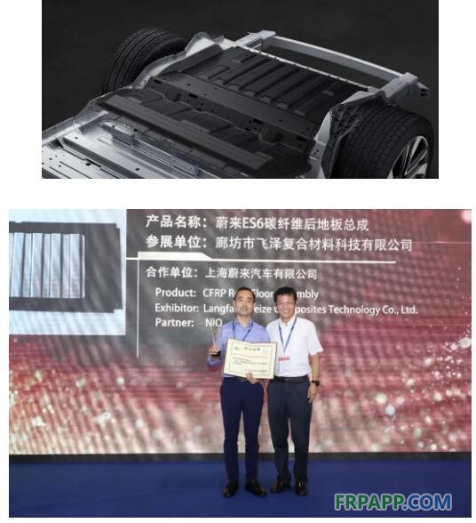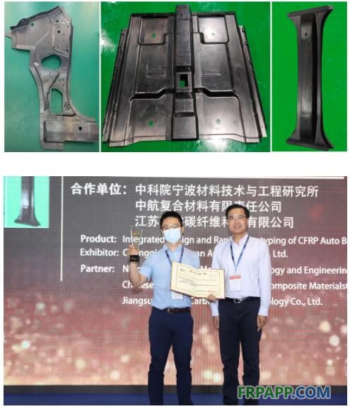三件展品分別為:一體化快速模壓碳纖維前地板、高壓RTM汽車A柱下內(nèi)板和熱塑性預(yù)浸料模壓頂蓋中橫梁。