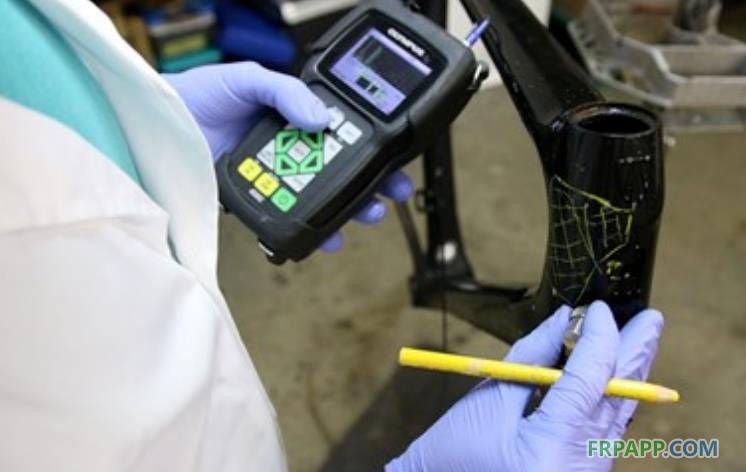 無損檢測儀用于檢測內部分層。它可以“看到”自行車車架的復合材料層的內部結構,而無需實際切入車架。根據Olympus的說法,45MG超聲波測厚儀通過精確測量超聲波換能器產生的聲脈沖穿過材料的一側所花費的時間來工作。在復合材料中,聲能從復合材料中纖維之間的各個晶粒邊界散射。據說該儀器能夠檢測物料中的不規則散射圖案,并將其發回給操作員。