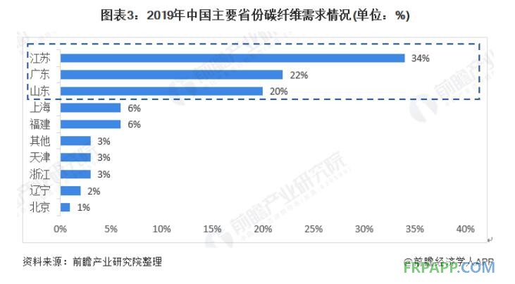 ——地區(qū)需求量:2019年江蘇、廣東及山東地區(qū)對(duì)碳纖維需求較大,合計(jì)占全國總需求的76%