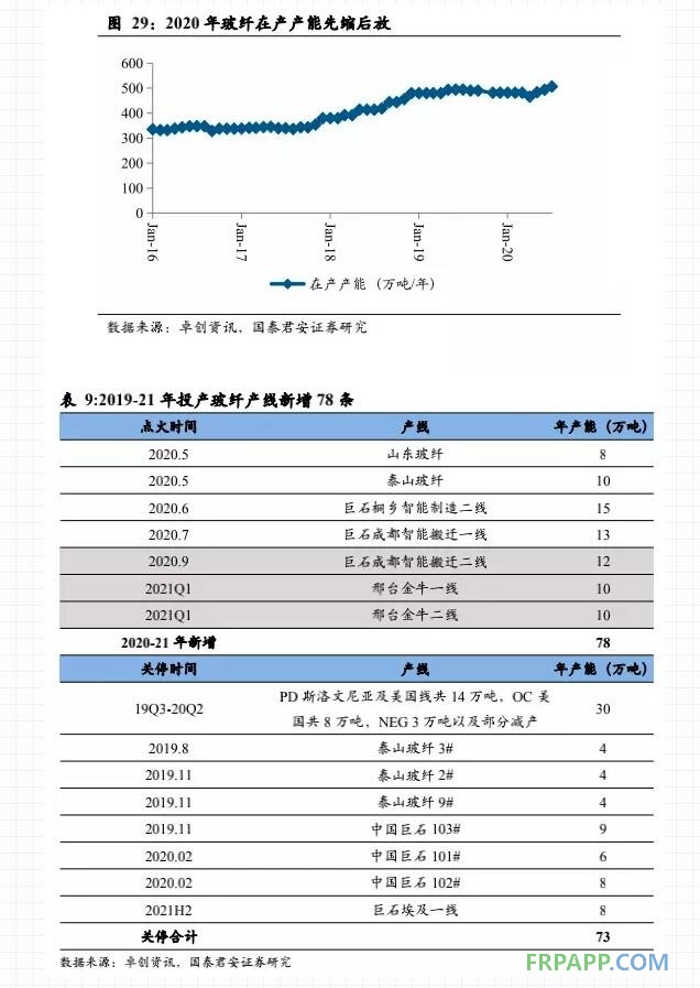 這里判斷接下來2020年9月中國巨石成都二線12萬噸點火投產,邢臺金牛2條10萬噸線2021年第一季度點火投產;但預計2021下半年巨石埃及8萬噸產線停產冷修。整體而言,2020-2021年產能新投產78萬噸,縮減約73萬噸,因此2020-2021年供給端沖擊有限。