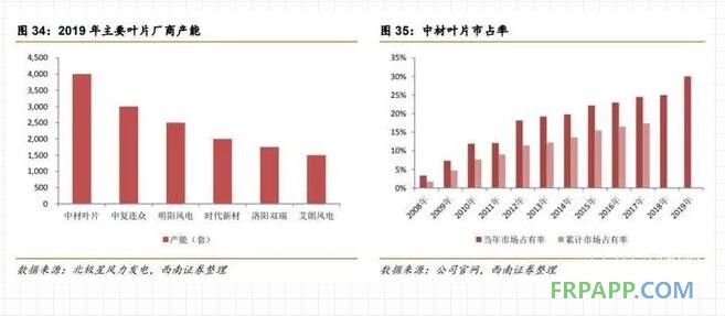國內(nèi)前三葉片制造商為中材葉片、中復(fù)連眾、明陽風(fēng)電。市占率分別為30%、11%、10%。中材葉片市占率連續(xù)九年位居國內(nèi)第一。