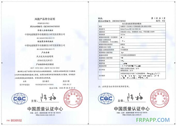 2020年8月,華東院166m免灌漿干式連接分片預制裝配式鋼-混組合塔架成功取得中國質量認證中心風能產品設計認證。