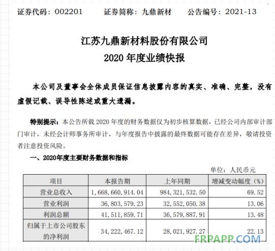 2月26日,九鼎新材(002201)發(fā)布2020年度業(yè)績(jī)快報(bào)公告,公告顯示,2020年1~12月?tīng)I(yíng)業(yè)總收入為1668660914.04元,比上年同期增長(zhǎng)69.52%,主要原因是報(bào)告期內(nèi)公司加大市場(chǎng)開(kāi)發(fā),把握住風(fēng)電新能源快速發(fā)展機(jī)遇,陸續(xù)取得江陰遠(yuǎn)景投資有限公司等風(fēng)電主機(jī)廠家的風(fēng)電葉片訂單,確保了2020年銷售目標(biāo)的實(shí)現(xiàn)。歸屬于上市公司股東的凈利潤(rùn)為34222467.12元,比上年同期增長(zhǎng)22.13%。