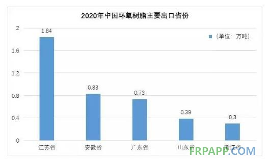 江蘇和安徽是國內(nèi)液體和固體環(huán)氧樹脂生產(chǎn)企業(yè)的主要集中地,2020年國內(nèi)環(huán)氧樹脂主要經(jīng)這兩個省份出口,合計出口量占全國出口量的57%以上。環(huán)氧樹脂主要出口省份見下圖: