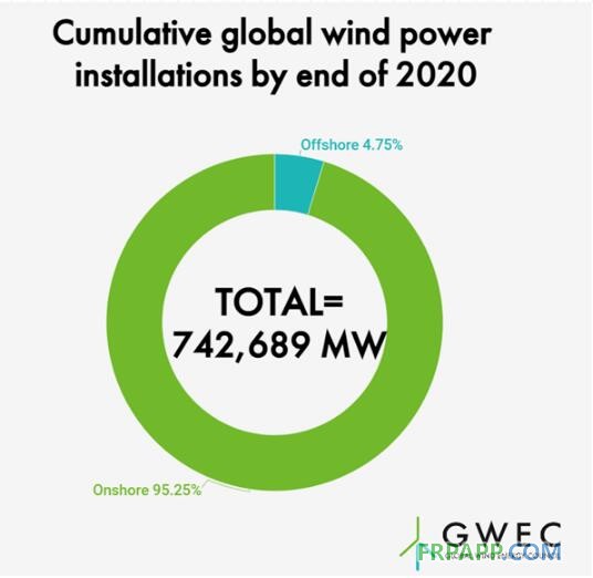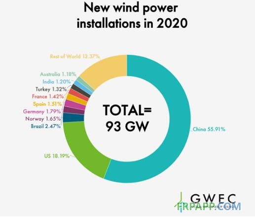 2020年全球新增風電裝機為93GW,比2019年增加了53%,面對新冠疫情風電行業顯示出強勁韌性。
