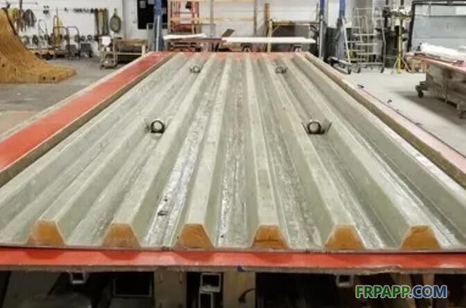 整個橋面由兩塊8英尺 x 25英尺的FRP橋板組成,總面積為16 x 25平方英尺,具有較高強(qiáng)度,且比傳統(tǒng)混凝土橋板輕90%,在工廠內(nèi)完成生產(chǎn)。由于橋板很輕,工人們將其運(yùn)至橋梁所在地,僅用叉車一天就可以完成安裝,大大縮短了安裝時間和能量消耗。