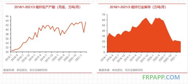 玻纖在產產能上升,庫存下降。3月末,玻纖在產產能43.38萬噸/月,環比上升12.0%;玻纖行業庫存19.77萬噸,環比下降5.4%。截至3月末,玻纖在產產能530.8萬噸(年化),較2月末增加23萬噸。其中中國巨石6萬噸電子紗點火;邢臺金牛4萬噸粗紗線復產+10萬噸粗紗線點火;OC余杭8萬噸粗紗線復產。內江華原5萬噸粗紗線冷修。截至3月末,玻纖庫存有19.77萬噸,環比降低1.1萬噸。