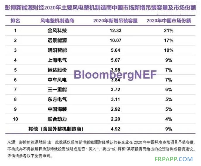 據彭博新能源財經近日發布的2020年中國風電整機制造商新增吊裝容量排名顯示,西門子歌美颯2020年在中國的風機吊裝容量為0.4GW,GE為1GW,Vestas 為1GW,三家公司2020年合計吊裝容量在中國市場的占比僅為4%,排名已跌出前十。