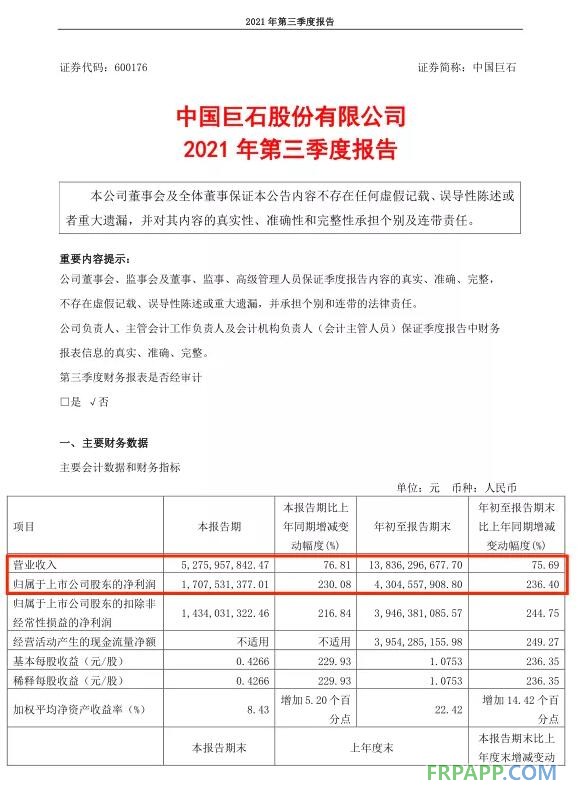 中國巨石公告,第三季度營業收入52.76億元,同比增長76.81%;凈利潤17.08億元,同比增長230.08%;前三季度營業收入138.36億元,同比增長75.69%;凈利潤43.05億元,同比增長236.4%。
