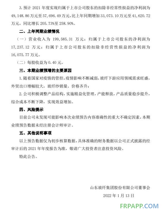 業績預增的主要原因:1.隨著國家對疫情的管控,疫情影響不斷減弱,玻纖下游應用領域需求旺盛,外貿出口增幅較大,玻纖紗銷量、價格齊升;2.公司積極調整產品結構,實施精益化管理,產能釋放,產品質量穩步提升,綜合成本不斷下降,實現效益增加。