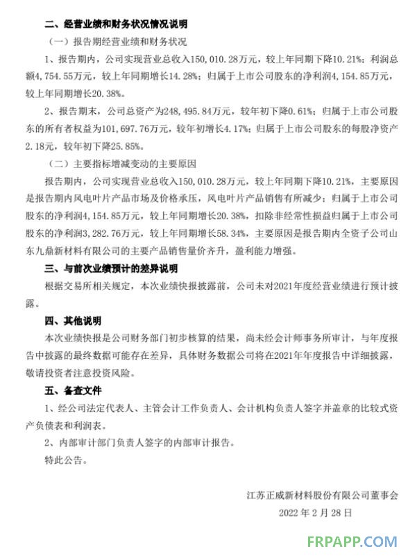 2月28日,正威新材發布2021年度業績快報,公告稱:報告期內,公司實現營業總收入150,010.28萬元,較上年同期下降10.21%,主要原因是報告期內風電葉片產品市場及價格承壓,風電葉片產品銷售有所減少;歸屬于上市公司股東的凈利潤4,154.85萬元,較上年同期增長20.38%,扣除非經常性損益歸屬于上市公司股東的凈利潤3,282.76萬元,較上年同期增長58.34%,主要原因是報告期內全資子公司山東九鼎新