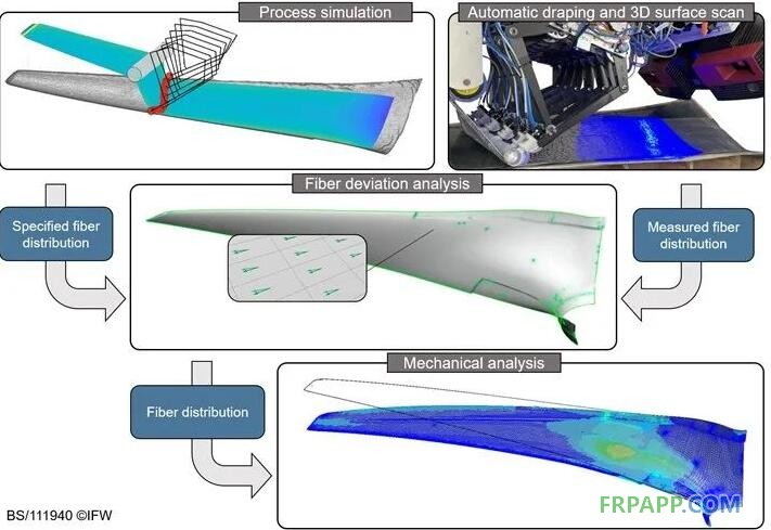 圖3 為AutoBLADE項目而開發(fā)的工藝在很大程度上是通過過程仿真和分析得到的。針對每一次鋪層試驗,首先采用Matlab軟件進行虛擬仿真,然后在實際鋪層中利用一個3D表面掃描儀進行掃描。利用掃描獲得的數(shù)據(jù),可以計算出鋪放在葉片形狀上的各層貼片的纖維取向,從而可以確定出實際的纖維角度與設計時假設的纖維角度之間的偏差,然后用有限元仿真來研究纖維角度偏差對轉子葉片力學性能的影響(圖片來自IFW)