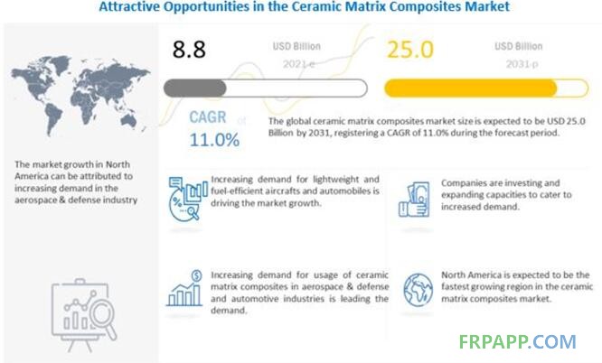 據(jù)MarketsandMarkets預(yù)計,全球陶瓷基復(fù)合材料市場規(guī)模預(yù)計將從2021年的88億美元增長到2031年的250億美元,年復(fù)合增長率為11.0%。由于全球各行業(yè)對陶瓷基復(fù)合材料的需求上升,陶瓷基復(fù)合材料行業(yè)正在增長。隨著疫情封鎖的結(jié)束和全球經(jīng)濟(jì)的復(fù)蘇將刺激預(yù)測期內(nèi)的需求。