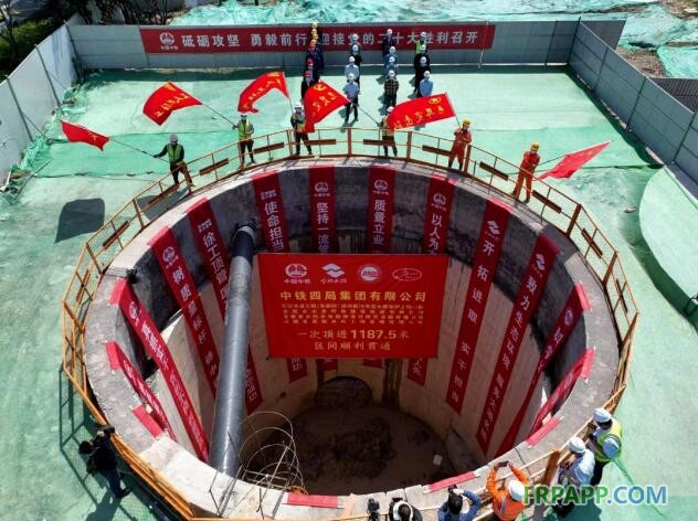 2022年5月4日上午11時,伴隨著刀盤的轉動,頂管機牽引著一節節新型連續纏繞玻璃鋼夾砂頂管像一條巨龍從接收井破洞而出,由中鐵四局承建的引江濟淮派河截污導流水質保護工程施工2標段6號井-5號井1187.5米頂進區間順利實現貫通,這一刻也標志著這種新型管材在實際工程應用中的單次頂進距離新記錄的誕生。