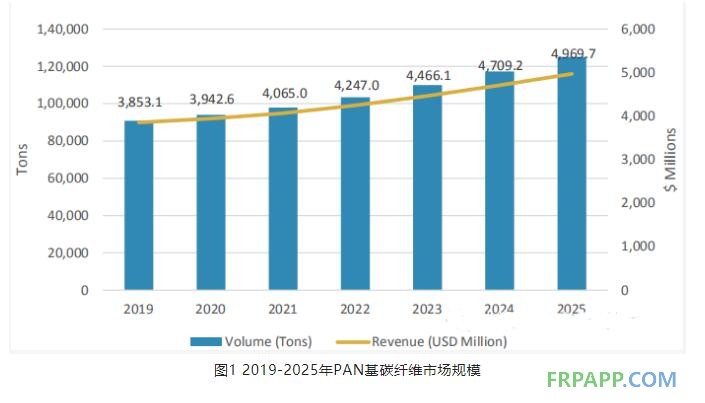 圖1顯示了以2019年作為基線到2025年全球PAN基碳纖維市場(chǎng)規(guī)模,2020年全球PAN基碳纖維產(chǎn)量約9.4萬(wàn)噸、市場(chǎng)規(guī)模39.4億美元,而到2025年預(yù)計(jì)將達(dá)到12.5萬(wàn)噸、49.7億美元,2020-2025年兩者年復(fù)合增長(zhǎng)率分別為5.9%、4.7%。