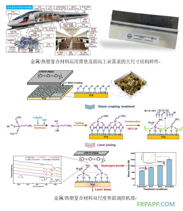 團隊提出通過微米級多孔結構的預制及納米級硅烷偶聯薄膜的定向引入,實現對金屬與碳纖維增強熱塑復合材料激光連接界面的微-納雙尺度定向強化設計理念。多孔結構的引入顯著提高了金屬表面的物理粗糙狀態,促進界面的機械嵌合行為的同時優化了金屬表面的化學狀態,極性官能團的吸附含量顯著提高,這為硅烷偶聯薄膜的定向引入提供了優異的條件。引入的納米級硅烷偶聯薄膜在激光連接過程中實現了對界面氫鍵作用的誘導并被精確捕捉與鑒定。這進一步提高了金屬/熱塑復合材料輕量化結構連接的可靠性,該設計理念也將為界面定向改性強化提供新思路,為金屬/熱塑復合材料界面氫鍵的誘導與鑒定奠定了理論基礎。