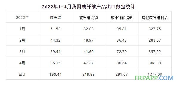 2022年4月我國(guó)出口碳纖維35.15噸,出口碳纖維織物47.27噸,出口碳纖維預(yù)浸料86.64噸,出口其他碳纖維制品308.38噸,出口碳纖維產(chǎn)品合計(jì)477.44噸。2021年1-4月我國(guó)累計(jì)出口碳纖維190.44噸,出口碳纖維織物219.86噸,出口碳纖維預(yù)浸料291.67噸,出口其他碳纖維制品1277.03噸,出口碳纖維產(chǎn)品合計(jì)1979.00噸。