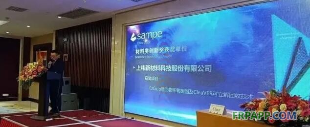 2022年11月14日, 經國際先進材料與制造工程學會(SAMPE)中國大陸總會專業評委評審,上緯新材“EzCiclo易可收環氧樹脂及CleaVER可立解 回收技術”項目榮獲 “2022年度材料類SAMPE中國創新獎”,11月15日,研發總監王洪榮代表上緯新材參加頒獎儀式。