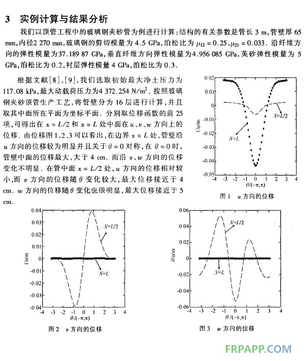 因此應(yīng)用Donnel - Mushtali 近似理論對復(fù)合材料層合圓柱殼的基本理論進(jìn)行簡化,井求解在外載荷作用下位移變形的計(jì)算結(jié)果能夠與工程實(shí)際中的變形吻合,同時(shí)也驗(yàn)證了玻璃鋼夾砂管力學(xué)性能的可靠性.可以應(yīng)用此理論來對纖維纏繞玻璃鋼夾砂管的屈曲、振動(dòng)等一系列力學(xué)性能進(jìn)行計(jì)算.